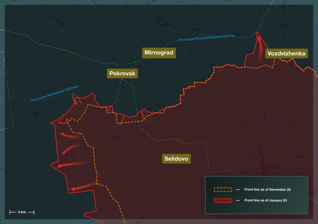 Im Gegensatz zu Pokrowsk liegt Mirnograd in einer Tiefebene, aus ukrainischer Sicht fast hinter Pokrowsk. Alle Versorgungsrouten in die Stadt führen entweder durch Pokrowsk selbst oder durch das kleine Rodinskoje im Norden.