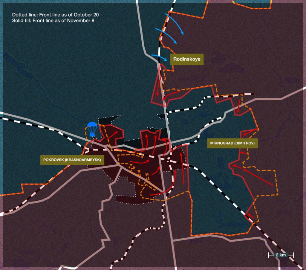 So war Pokrowsk bis Oktober nahezu vollständig eingenommen. Zuerst fiel das Gebiet südlich der Bahnlinie, danach die Hochhausviertel im Norden der Stadt. Am Samstag standen nur noch einige Wohngebiete und das Krankenhaus an der Tyulenev-Straße im Nordosten unter ukrainischer Kontrolle.